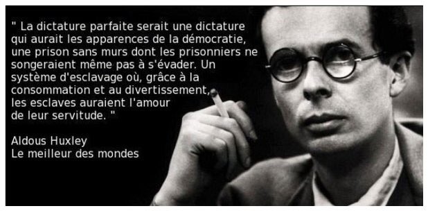 Une citation d aldous huxley la dictature parfaite serait une dictature qui aurait les apparences de la démocratie une prison sans murs dont les prisonniers ne songeraient pas à s évader. Citation du meilleur des mondes. La dictature parfaite serait une dictature qui aurait les apparences de la démocratie une prison sans murs dont les prisonniers ne songeraient même pas à s évader.